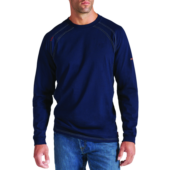 sku: 10012256This crew neck is made from flame resistant jersey cotton and has a rib-knit collar and cuffs for easy wear. Greater Arm Mobility technology keeps shirt cuffs down. Ariat’s Moisture Movement Technology pulls moisture to the outside to keep you dry and comfortable. HRC2, ATPV 8.9, NFPA 70E, NFPA 2112 rated.